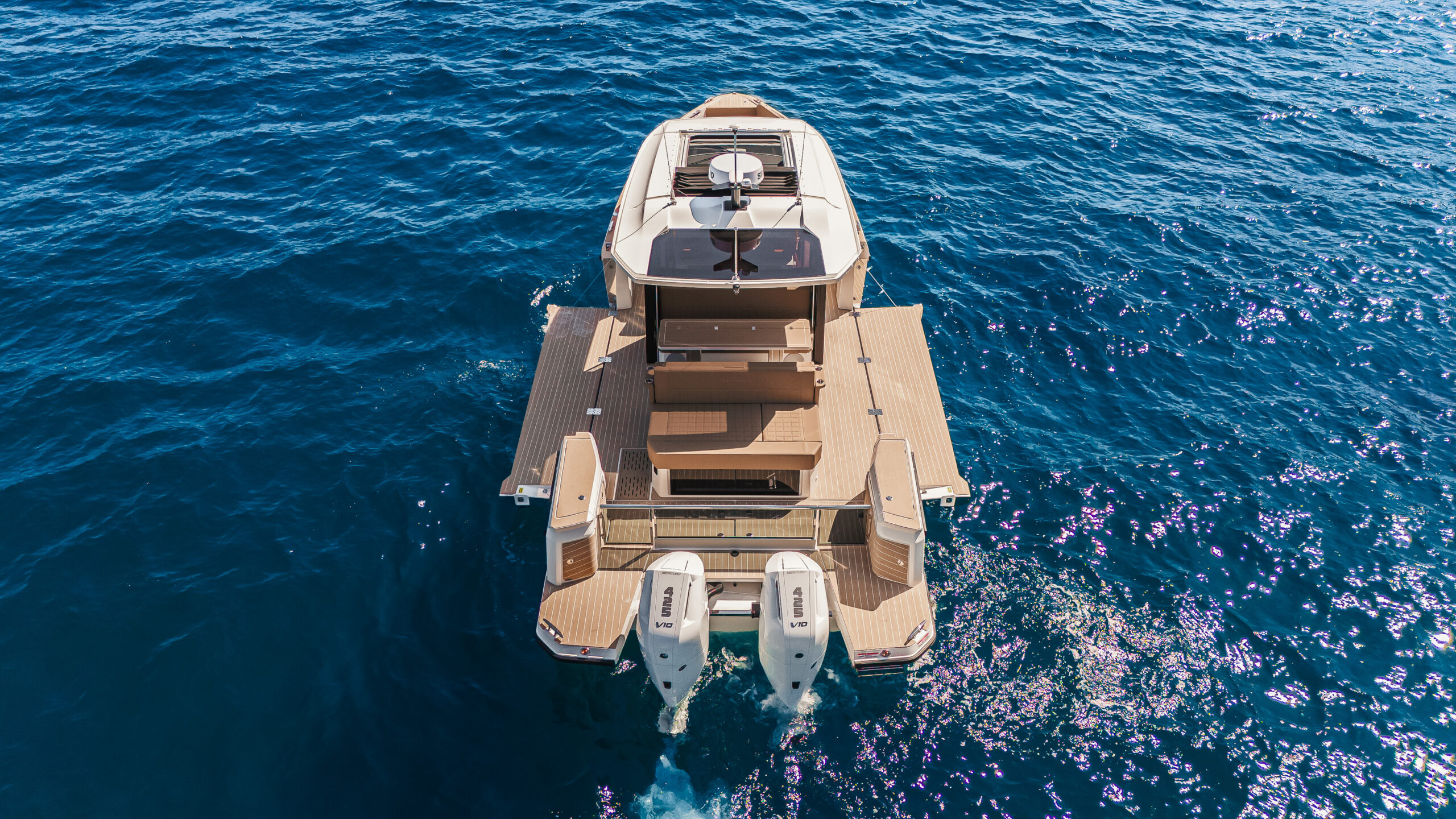 Lightweight design and powerful outboard engines deliver dynamic, precise handling, stable even in choppy conditions. The ergonomic helm, with comfortable seats, intuitive controls, and a sleek dual-floating display dashboard, puts the driver at the heart of the action, while the full-height windshield protects from wind and spray.