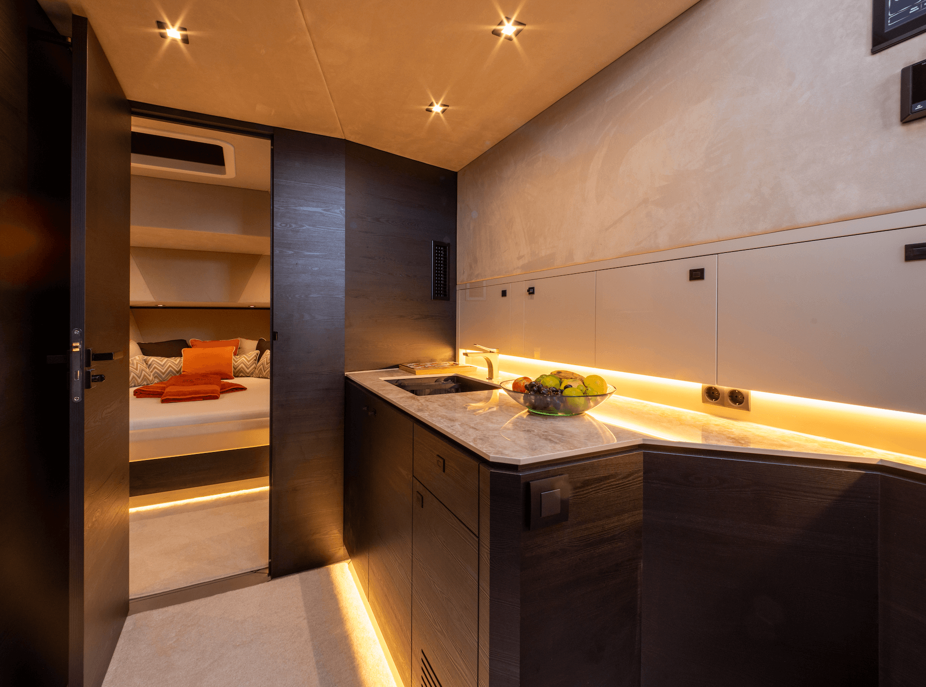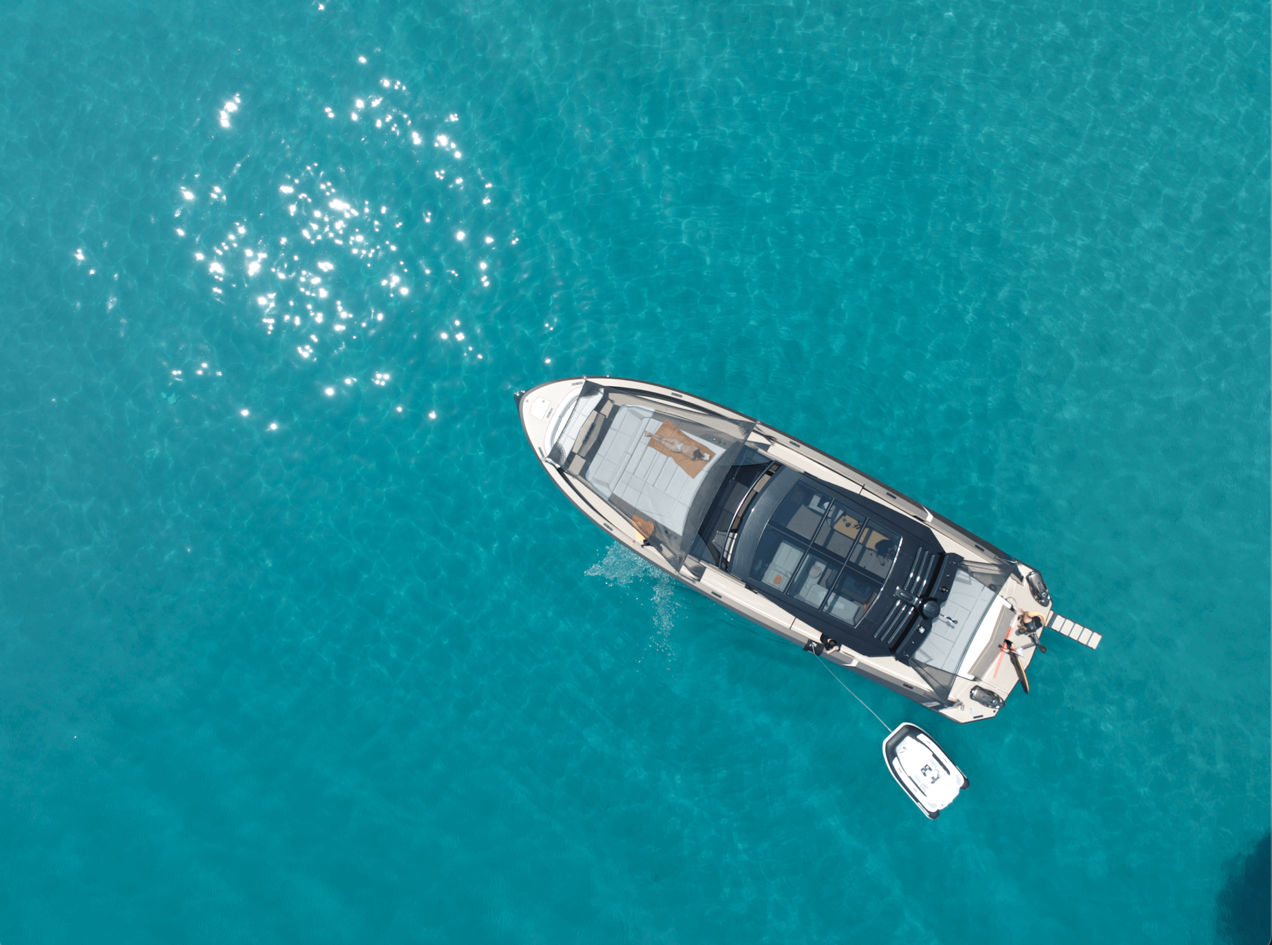Technologie : système audio Fusion haut de gamme, écrans Garmin 12", stabilisateur Seakeeper 9 pour un confort optimal en mer