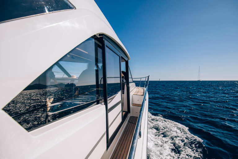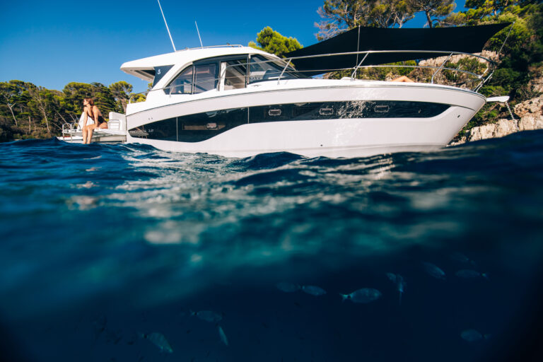 L’Antares 12 Coupé se distingue par une silhouette moderne et fluide, caractérisée par de larges vitrages de coque qui accentuent l’esthétique élégante du bateau et créent une continuité visuelle entre l’intérieur et l’extérieur.