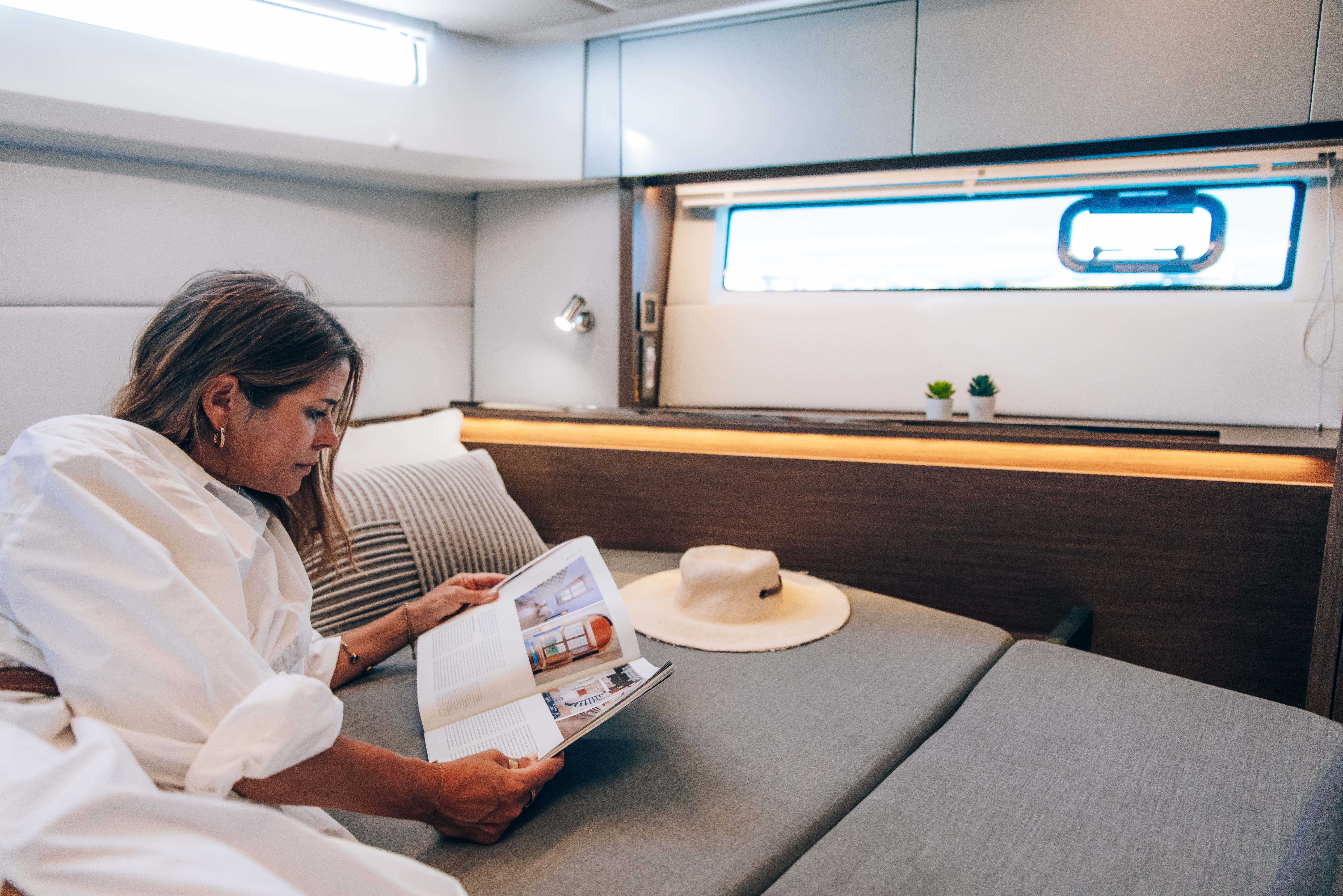 La terrasse électrique à tribord prolonge naturellement l’espace de vie sur l’eau et facilite l’accès à la mer pour la baignade ou les activités nautiques. Les mains courantes et galeries en inox, la fermeture complète de cockpit en Graphite, l’éclairage LED indirect intérieur et le projecteur de pont renforcent confort et sécurité à bord.