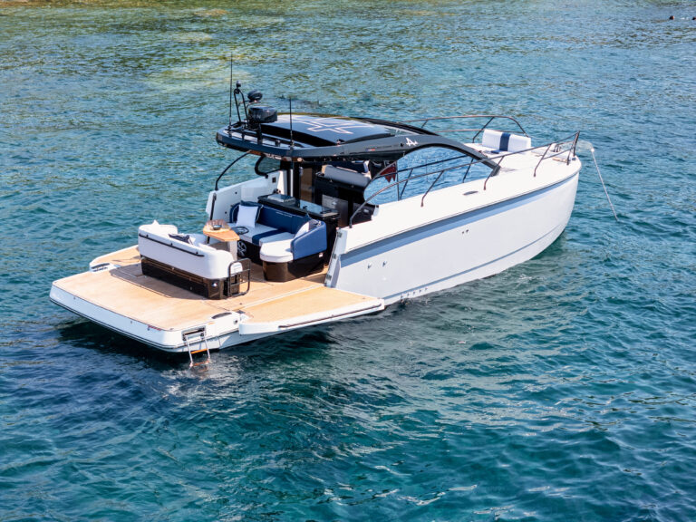 Le Gran Turismo 40 se distingue par une ligne moderne et fluide qui allie élégance et caractère sportif. Son cockpit arrière très spacieux peut accueillir confortablement plusieurs personnes autour de banquettes en vis‑à‑vis et d’un bar. Des surfaces vitrées soigneusement intégrées favorisent une circulation fluide entre l’intérieur et l’extérieur, créant un espace convivial pour profiter de la mer.