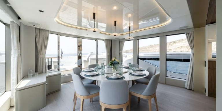 L'agencement du pont est conçu pour la flexibilité : il peut être configuré selon les envies, que ce soit pour des repas intimes en famille ou des réceptions plus sophistiquées.